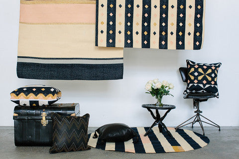 100% Cotton, hand woven cushion featuring gold metallic thread.